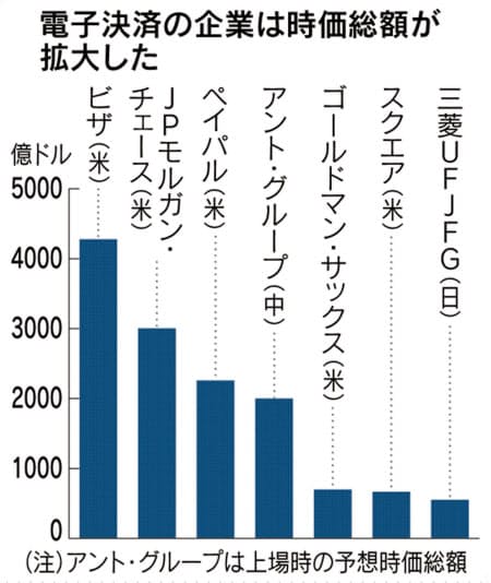 株式時価総額ではより大きさが目立つ。ペイパルの約2300億ドルは日本のメガバンク3社合計(約1300億ドル)を7割上回る。アント・グループは新規株式公開(IPO)を予定し、時価総額は米銀2位のバンク・オブ・アメリカ(約2200億ドル)に迫る2000億ドルが目標だ。