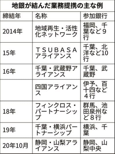 地銀同士の業務提携の動きは全国で相次ぐ。取引先のビジネスマッチングを支援したり、ATMを相互開放したりするなど分野別の取り組みも多い。千葉銀など10行が参加する「TSUBASAアライアンス」はシステムを共同運用する。9月に経営統合案が浮上した青森銀とみちのく銀も19年に包括提携を結んでいる。