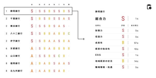 総合力で首位の静岡銀は10月に山梨中央銀行と業務提携で合意したと発表した。山梨中央銀も総合力で21位に入った。リスク傾向の分析では、収益力の低下に注意が必要な地銀が18行あった。