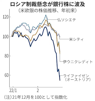 米オッペンハイマーの銀行担当アナリスト、クリス・コトウスキ氏は「米銀にとって理論上最大のリスクは、欧州銀のいずれかが(デリバティブや外国為替取引などで)取引契約の義務を果たせなくなることだ」と指摘する。オーストリアのライファイゼン・バンク・インターナショナルや仏ソシエテ・ジェネラルといったロシア事業の比率が大きい欧州銀行は株価急落に直面している。