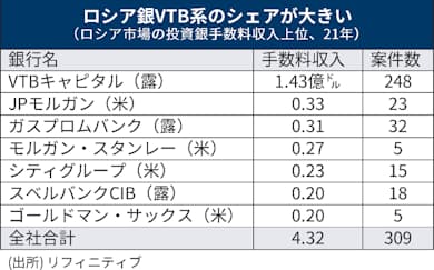 投資銀行事業にも波及しそうだ。金融情報会社リフィニティブによると、ロシア市場ではVTBバンクの子会社が投資銀手数料収入シェアで3割を握っている。米JPモルガンや米モルガン・スタンレーなど米系のシェアは大きくないが、VTBと協力しながら引受業務やM&A(合併・買収)助言を手掛けるケースも多いとされる。VTBが米国の制裁対象になったことで、コンプライアンス(法令順守)の観点から、業務の見直しを迫られる可能性がある。
