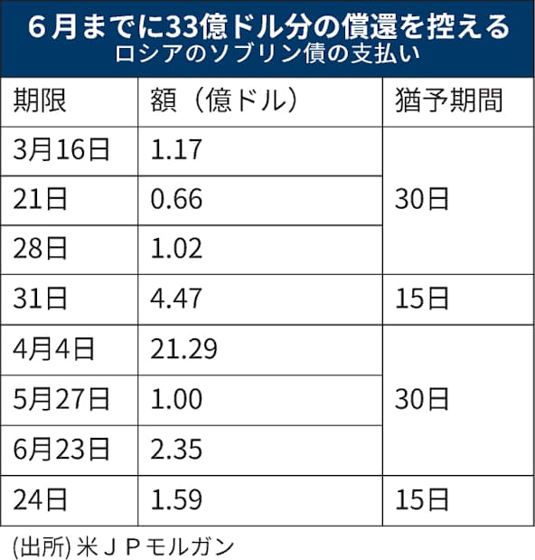 JPモルガンがロシア政府による国債や政府機関債など「ソブリン債」について支払いの条項などを整理した。グローバルに流通するドルやユーロなど「ハードカレンシー」(国際通貨)建ての国債で債務不履行の懸念が著しく高まっているという。