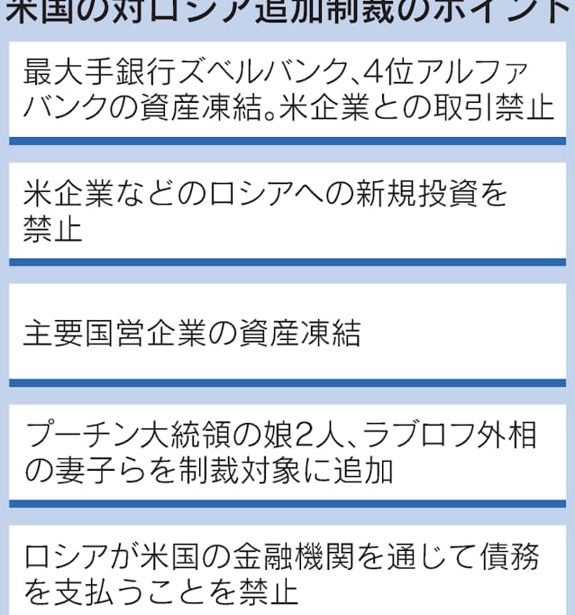プーチン大統領の娘2人やラブロフ外相の妻子、メドベージェフ前大統領らも資産凍結や取引禁止の制裁を科す。個人への制裁はプーチン氏本人やペスコフ大統領報道官に科してきたが、対象を広げて政権への圧力を強める。