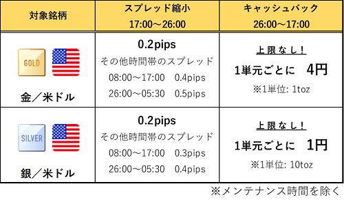 キャンペーン期間中の17:00~26:00の時間帯において、「金/米ドル」・「銀/米ドル」のスプレッドを下記表のとおり縮小いたします。