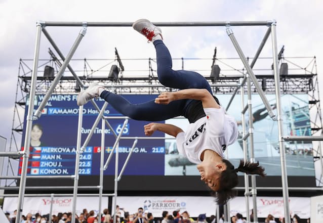 障害物を跳び越えていく体操の新種目パルクールの第1回世界選手権最終日は16日、東京・有明アーバンスポーツパークで行われ、技の難度や出来栄えを争うフリースタイルの女子決勝で32歳の山本華歩が25.0点で銀メダルを獲得した。日本勢で初の表彰台。