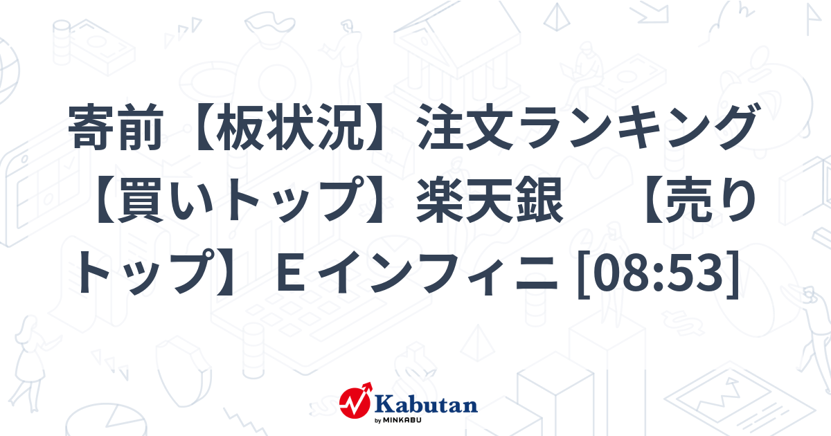 寄前【板状況】注文ランキング 【買いトップ】楽天銀 【売りトップ】Eインフィニ [08:53] | 特報 - 株探ニュース - 株探ニュース