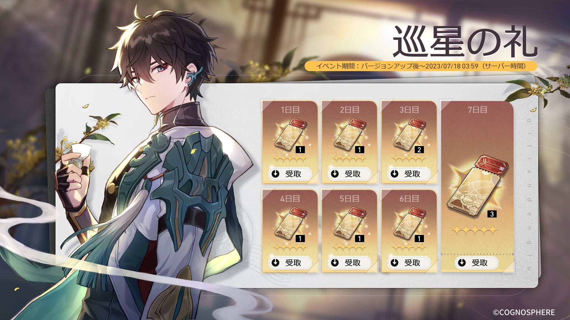 ただいま、ログインボーナスイベント「巡星の礼」を開催しております。ゲームにログインすると、「旅記録」でその日の報酬を受け取ることができます。報酬は開拓者様の累計ログイン日数に応じて順次解放されていきます。最大10連分の「星軌専用チケット」がもらえます!ぜひご参加ください。