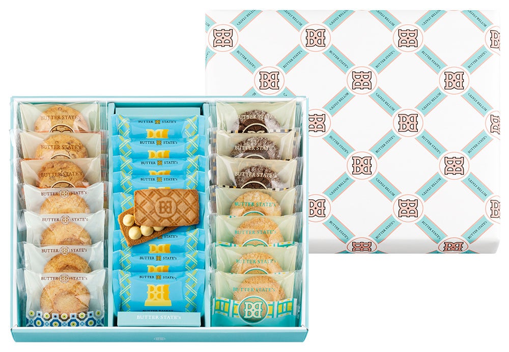 代表作「バターステイツ」は、北海道産バターの⾹りが⼝いっぱいにあふれる “最⾹峰のバタークッキー”。北海道産バターを極限まで練りこんだバターリッチなスペシャル⽣地で、⾷べる前から⾹りあふれる“最⾼峰にして最⾹峰”のおいしさを作りあげました。本品の特徴である⼭の姿は、バターのとろけた証。⽣地のバターがなだれとろけた瞬間で焼きとめる特別製法「なだれとろけるマウンテン焼き」で、サクサクのバターマウンテンに仕上げています。芳醇なバター⾹るベーシック、ショコラ、アーモンド、期間限定ココナッツミルクの豊富な4味。