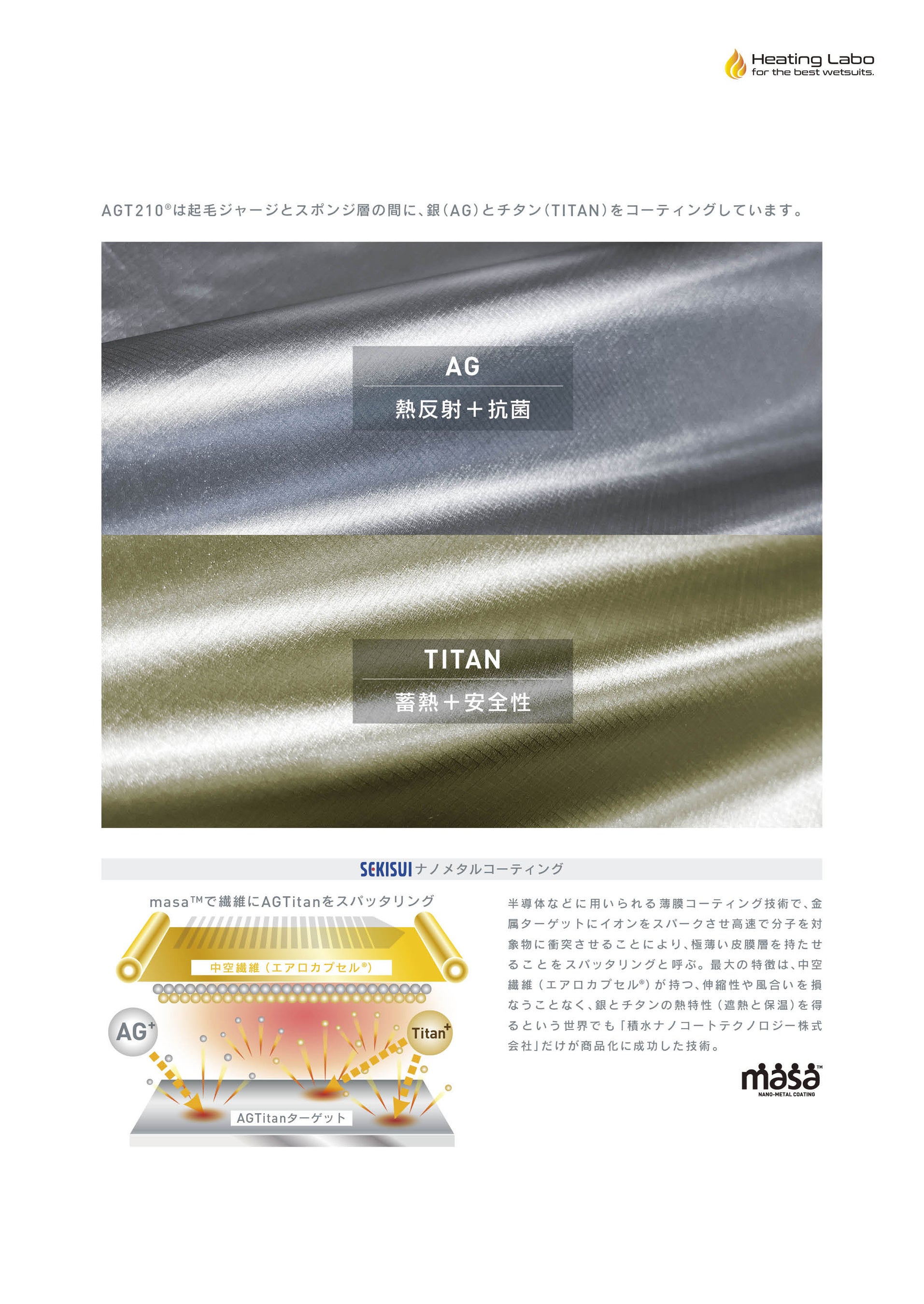 ウエットスーツの重量を3割軽くする【世界初の金属の熱特性を利用した魔法瓶効果】を持つAGTitan210®。「①中空繊維 ②AG(銀)③TItana(チタン)④独立気泡ライムストーンスポンジ ⑤表皮ラバー」の5層構造。