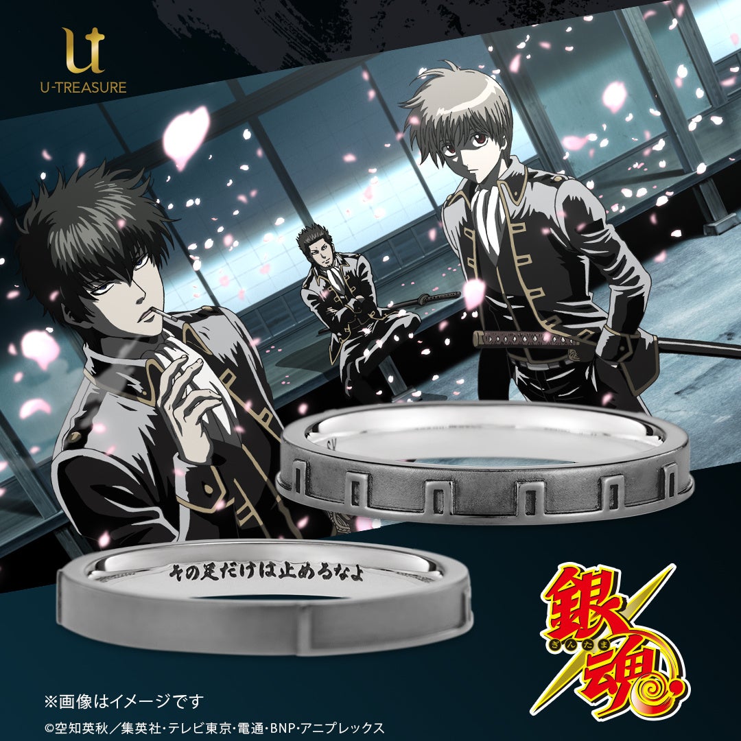 このたびの新作は、攘夷戦争時代を共に生き抜いた『坂田 銀時』『桂 小太郎』『坂本 辰馬』『高杉 晋助』4人をイメージした流れるような4本のラインを描いたデザインのリング(指輪)と、真選組として共に生き抜く『近藤 勲』『土方 十四郎』『沖田 総悟』3人をイメージして隊服から着想を得たデザインのリング(指輪)に印象的なセリフを刻印しました。