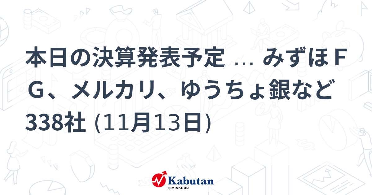 本日の決算発表予定 … みずほFG、メルカリ、ゆうちょ銀など 338社 (11月13日) | 注目株 - 株探ニュース